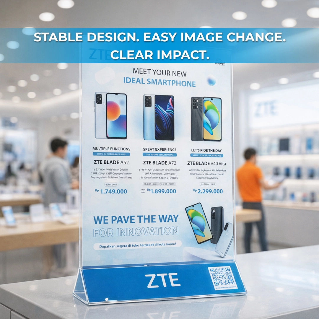 Integrated ZTE branding on the base strengthens brand visibility while preserving a clean, professional presentation. With its precision cut acrylic structure, smooth surface clarity, replaceable image system, and stable triangular base design, this display stand is perfectly suited for official ZTE retail stores, electronics outlets, exhibitions, and branded promotional spaces.
