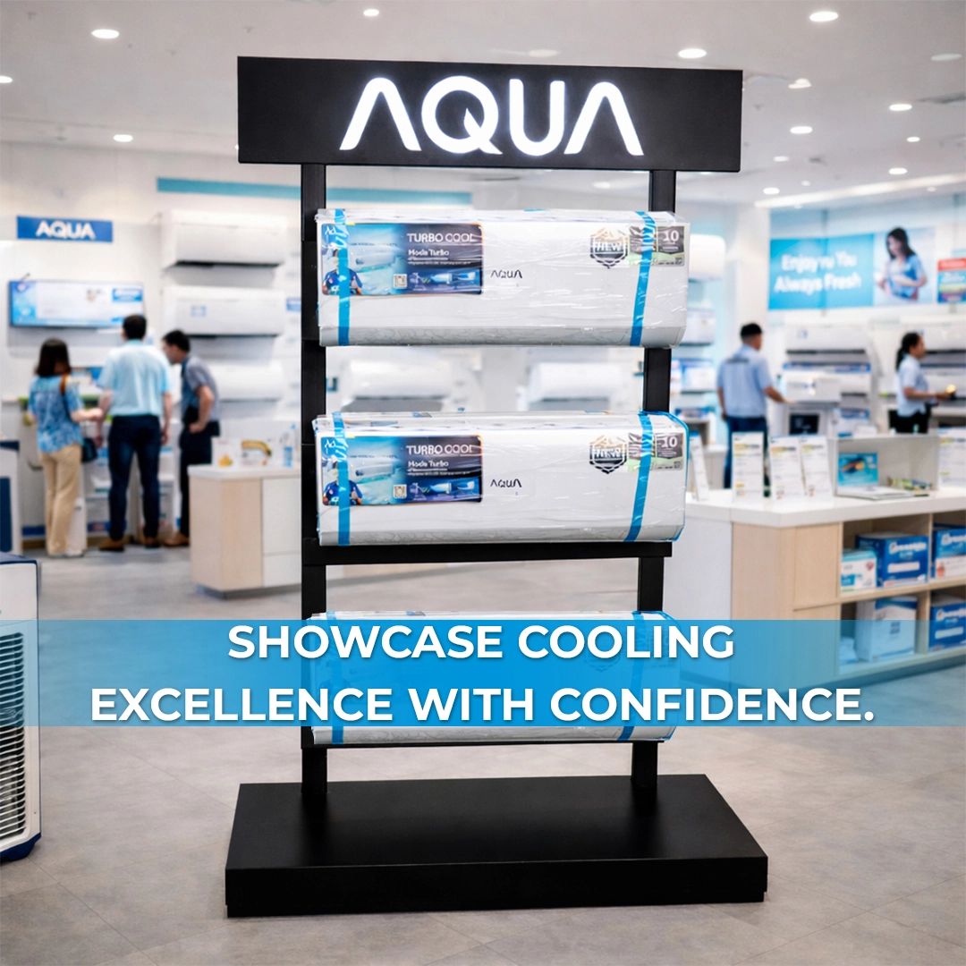 Designed to securely hold multiple indoor AC units, the rack ensures proper spacing, balanced proportions, and a neat presentation that improves customer engagement and product comparison. Its minimalist black finish complements AQUA’s modern retail identity while allowing the products to remain the primary visual focus.