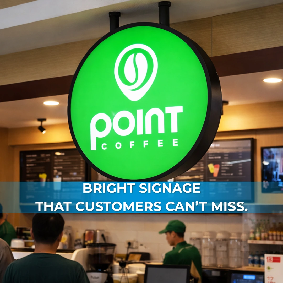 Point Coffee Signature LED Lightbox is a professional grade illuminated branding solution designed specifically for modern coffee retail environments. Engineered for maximum visibility and brand impact, this high brightness LED lightbox delivers crisp logo clarity, uniform light diffusion, and a clean architectural presence that enhances both interior aesthetics and customer recognition.