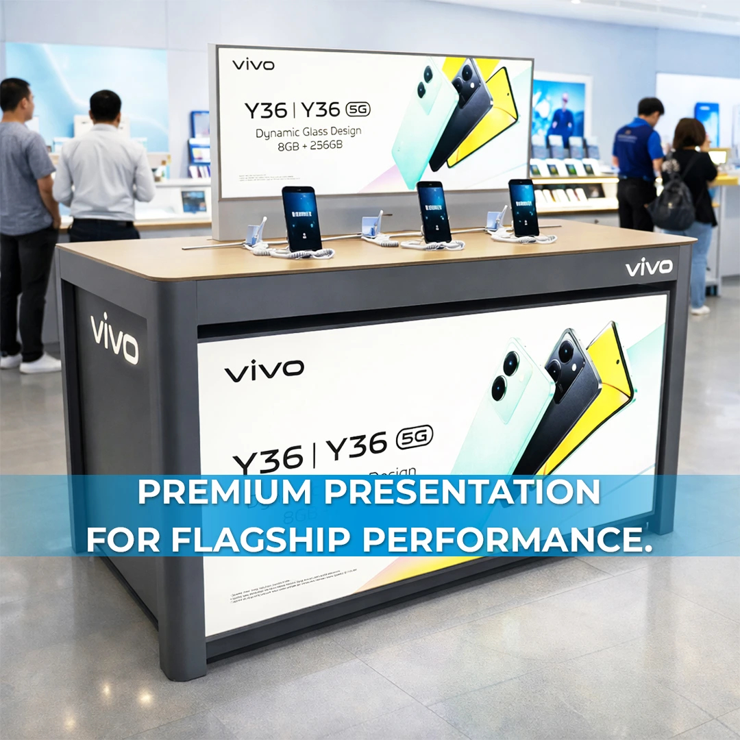• Optimized Smartphone Display Surface: Designed to accommodate multiple Vivo smartphones with accurate spacing, official retail stands, and secure anti theft fixtures without clutter.