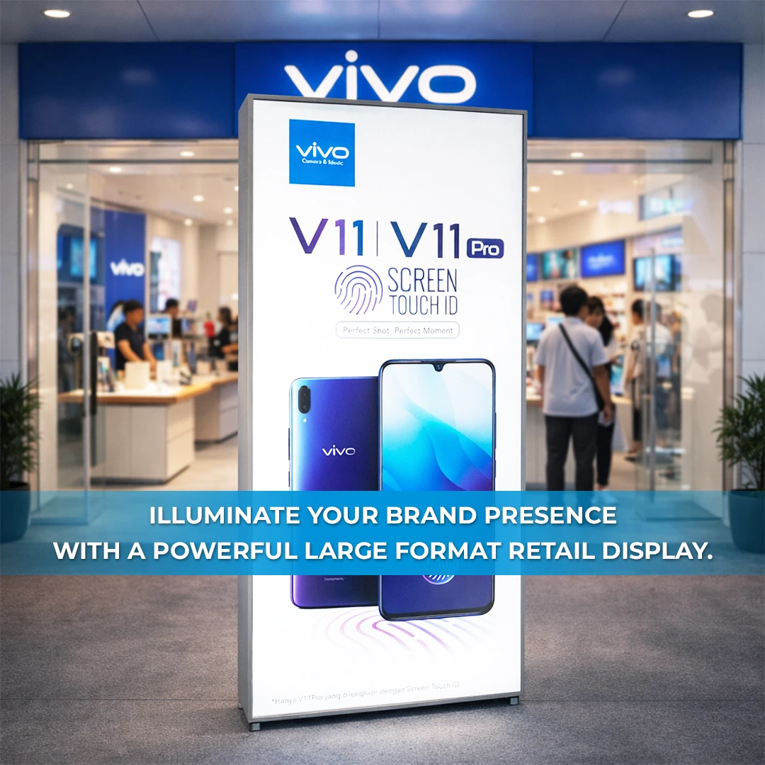 The Vivo Signature Large Format LED Backlit Display is a large format illuminated promotional solution designed to maximize brand visibility in high traffic retail environments. Standing approximately 2 meters tall, this light box is engineered to deliver powerful visual impact while maintaining a clean, modern, and professional appearance consistent with official Vivo retail standards.