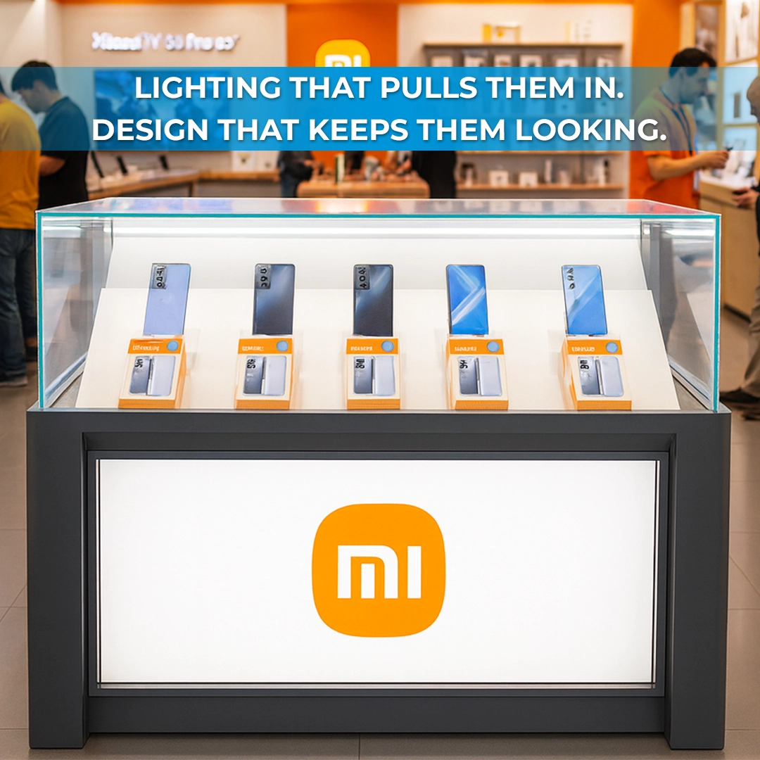 Xiaomi Modern Showcase with Integrated LED Lightbox is a high end retail presentation counter designed specifically for modern Xiaomi showrooms. Engineered with a crystal clear glass enclosure, this showcase provides maximum visibility of smartphones and packaging placed inside. The lower section features a bright frontlit LED panel that delivers consistent illumination, enhancing product appeal in any retail environment.